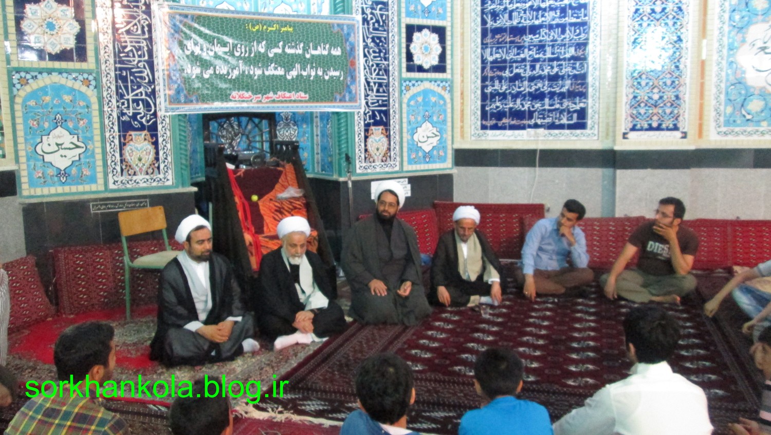 در این تصویر حجج اسلام آقایان رنجبر (از سازمان تبلیغات اسلامی گرگان)، بابامحمدی(امام جمعه بهاران)، جوانشیر (از مبلغین حوزه علمیه قم) و حجت الاسلام ساورعلیا و همچنین آقای محمدرضاباقری عضو محترم شورای شهر و مسئول ستاد اعتکاف دیده می شوند که در جمع جوانان معتکف در مسجد امام حسن (علیه السلام) سرخنکلا حضور دارند.